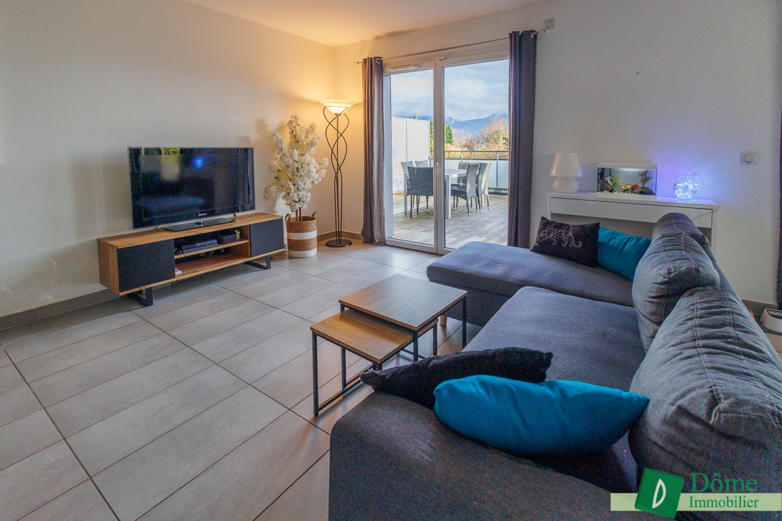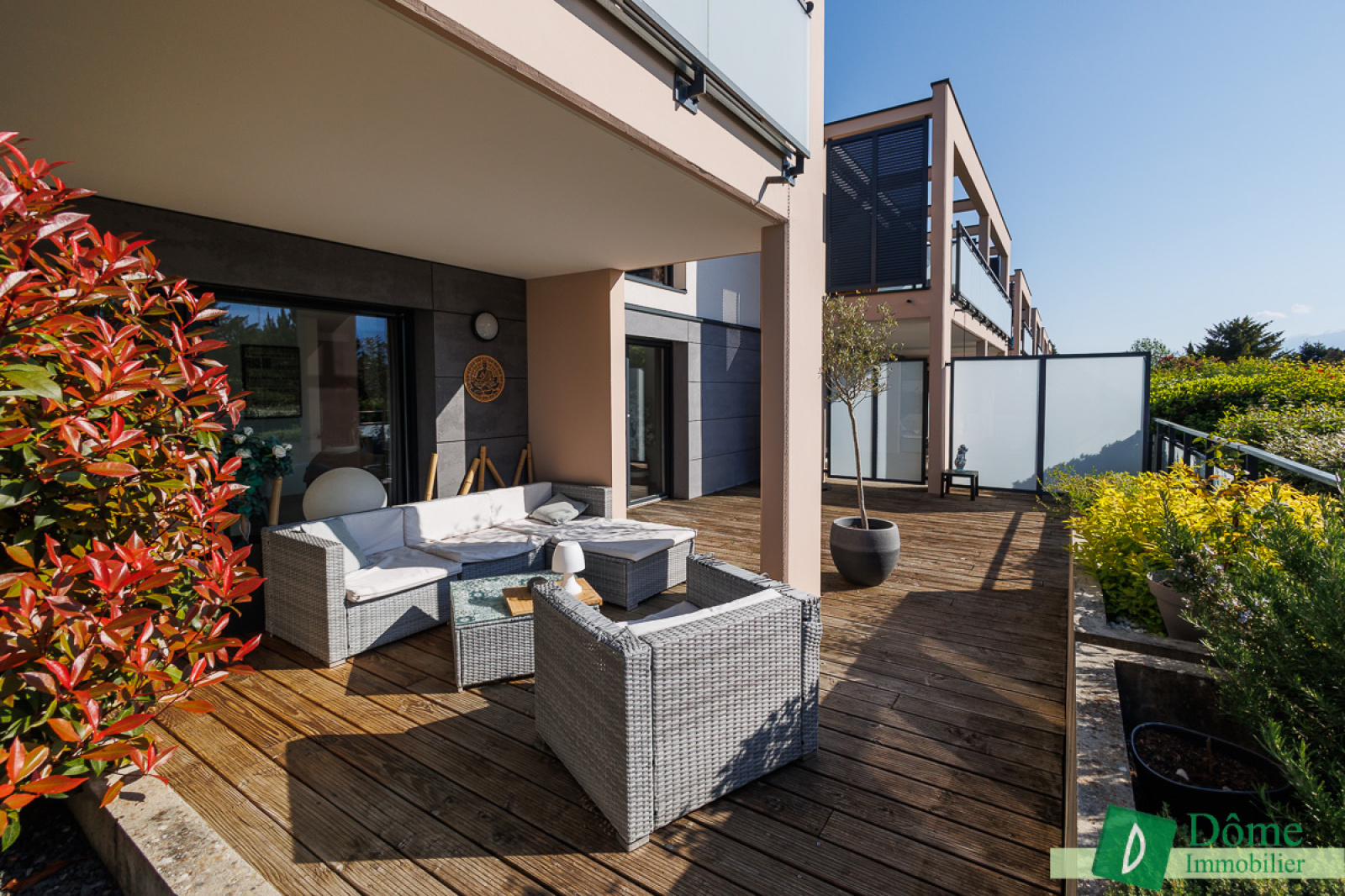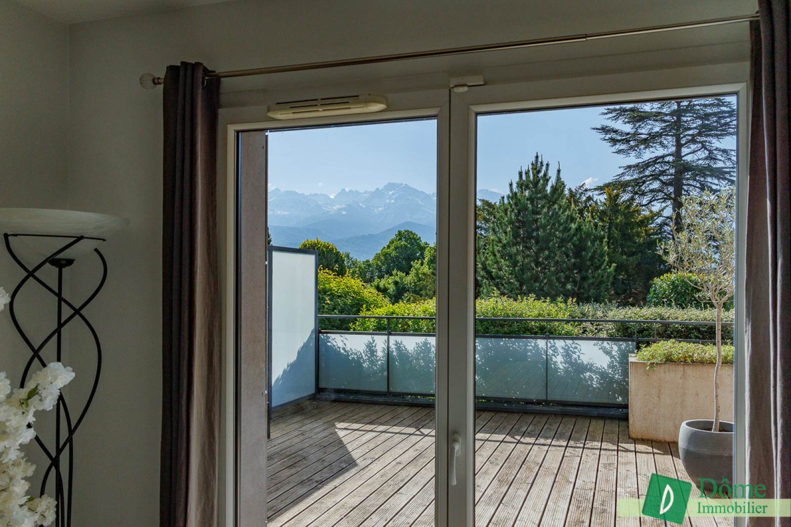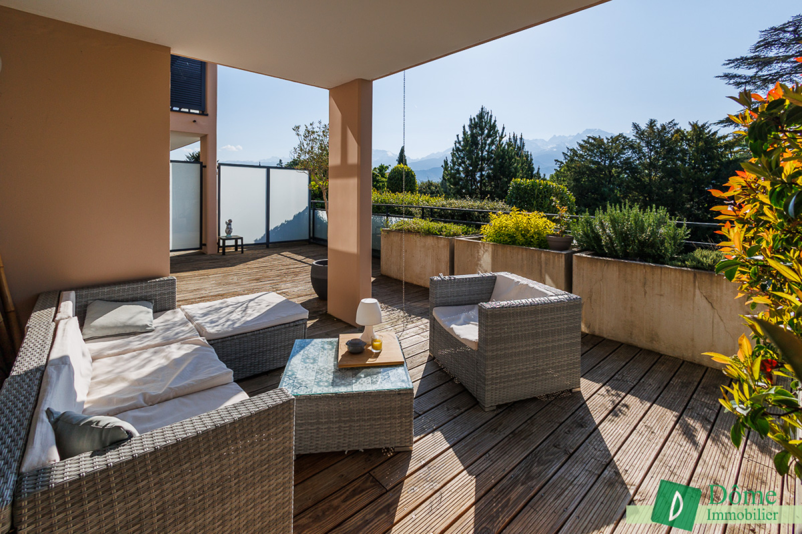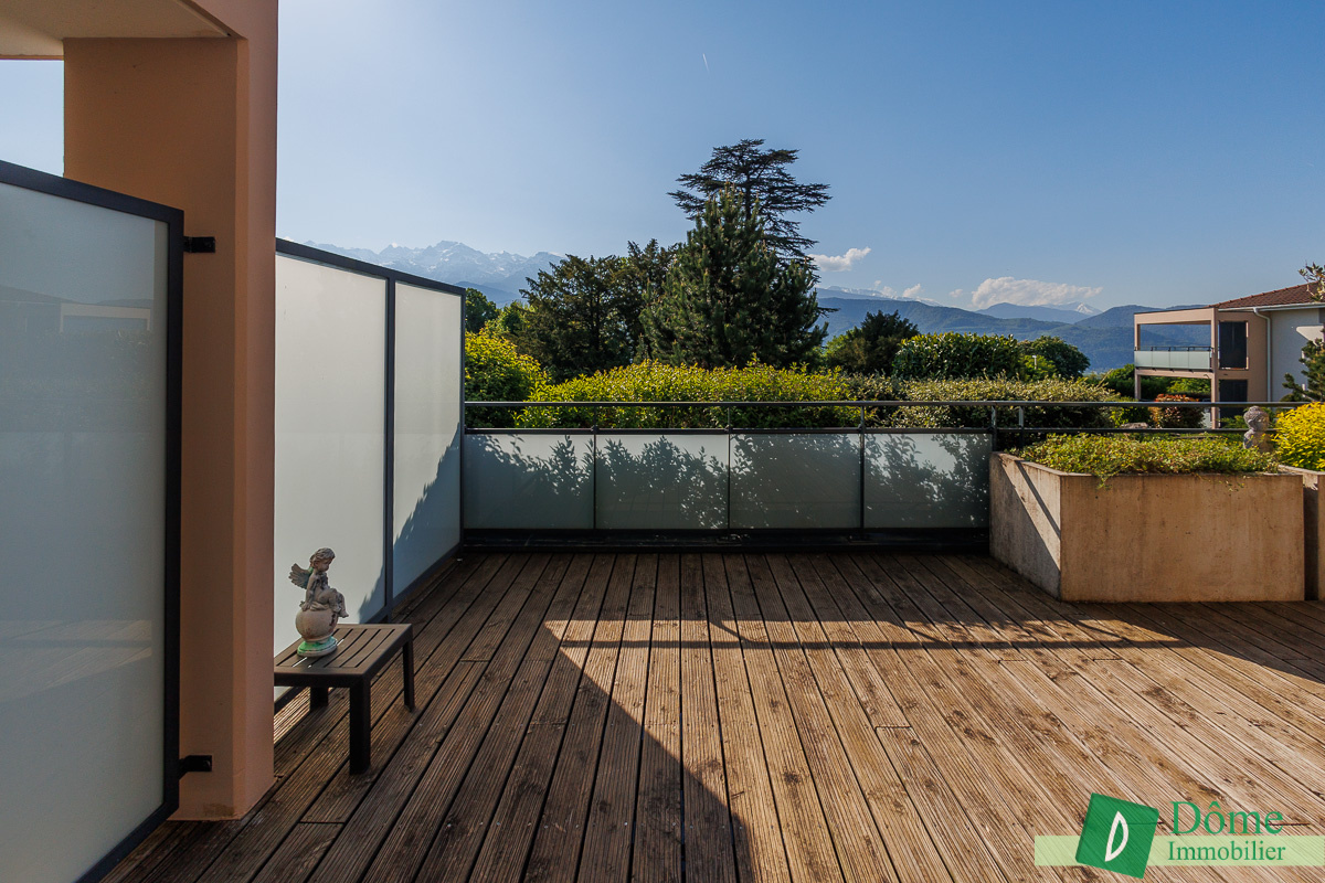 En rez-de-jardin, cet appartement décoré avec goût se compose d’une large entrée avec rangements, d’une lumineuse pièce à vivre avec cuisine ouverte de 36 m² avec accès à une vaste terrasse bois de 48 m², doublement exposée sud-est et ouest offrant une vue imprenable sur les massifs ainsi qu’une luminosité fort agréable tout au long de la journée.
